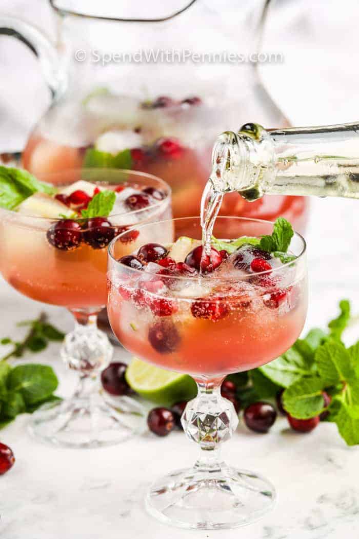 This Cranberry Champagne Punch is loaded with fresh fruit and mint leaves. It's the perfect cocktail for Thanksgiving get-togethers!